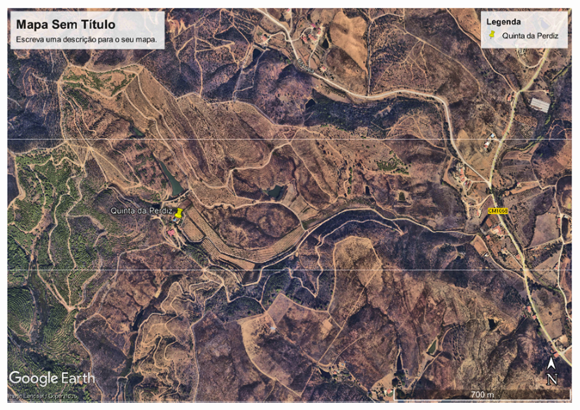 Matrice rústica : Secção E – Artigo n° 1 / Relief doux (env. 120–140 m), couvert forestier dominant, réseau interne de pistes. Ressources en eau : plusieurs plans d’eau/mares (ordre de grandeur > 2,5 ha cumulés).